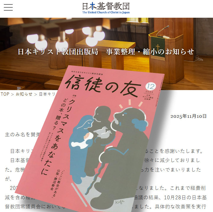 また、同出版局が発行する月刊誌『信徒の友』12月号にも同趣旨の告知が掲載されたが、同誌や『こころの友』などの定期刊行物について、4月以降も発行が継続できるよう、「日本基督教団とは別の新たな事業形態を有志の方々に備えていただく」よう検討中であること、「日本基督教団の教職・信徒の働きや学びに限定せず、これから神さまと出会うであろう方々へ向けて多様な形態を模索しながら新たな文書伝道が展開すること」を願っている旨が加筆されている。