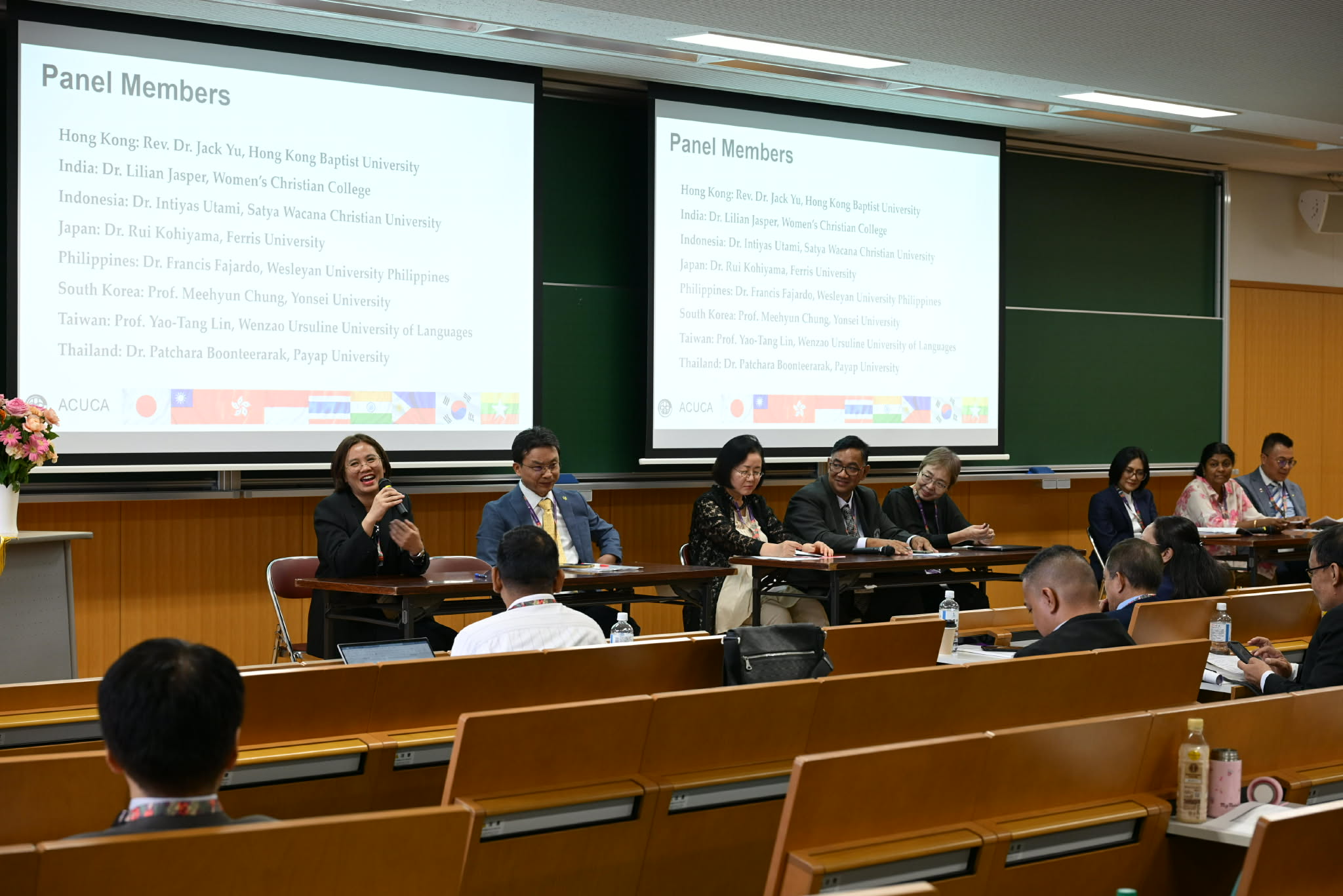 14日午後のパネルディスカッションでは八つの国、地域から8人の登壇者が今次総会のテーマの下、AI(人工知能)とキリスト教、大学教育がどう関わるべきかについて、それぞれ講演を行った。