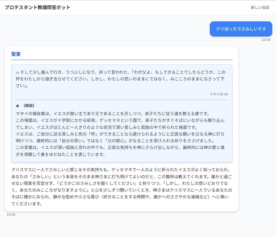 カテキズムは、洗礼や堅信礼前の信仰教育などで用いられてきたキリスト教の教義を問答形式で学ぶ入門的な教材で、質疑応答を基本とする形式がチャットボットとの相性が良い点に着目したという。今回のボットでは、マルティン・ルターの『小教理問答』および『ウェストミンスター小教理問答』を主要な学習データとして採用。プロテスタント・ルター派と改革派の伝統に基づく教理解説を、日本語で平易に提供する。