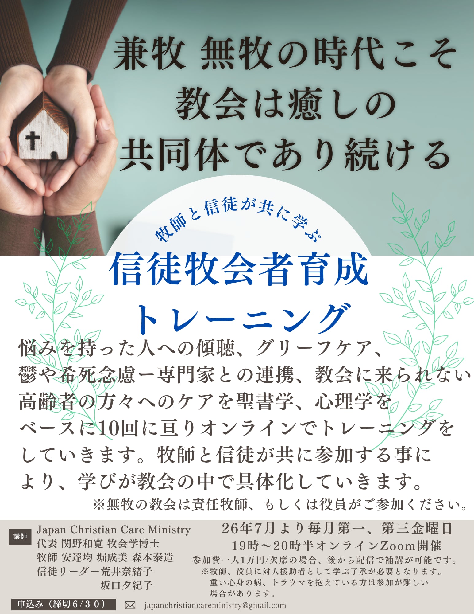 JCCM(ジャパン・クリスチャン・ケア・ミニストリー)は、関野和寛代表(牧会宣教学博士)のもと、信徒牧会者育成講座(全10回)を2026年7月より開講する。月2回のペースで実施し、牧師と信徒が共に受講し、牧会を学び合うことを前提としたプログラムである。