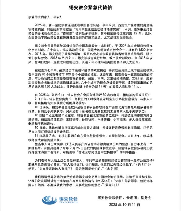 シオン教会は、2018年に当局の命令で北京の主会堂が強制閉鎖されたが、「緊急祈祷要請書簡」によると、過去6〜7年間、オンラインと対面での活動を通して全国約40都市に100か所以上の小規模な枝教会を設立してきたという。しかし今年に入ってから、各地の拠点に対する弾圧が一段と強まっており、派出所に連行された信徒は延べ150人を超え、11名の牧師・スタッフが行政拘留を受けたと報告している。