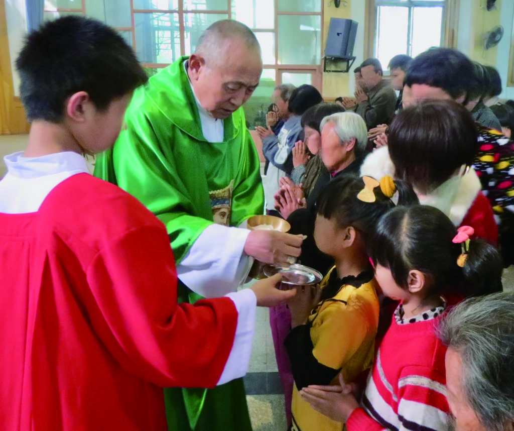 *写真=ミサに参加した児童に聖体拝領する故・賈治国司教(プライバシー保護のため画像を一部加工しています)