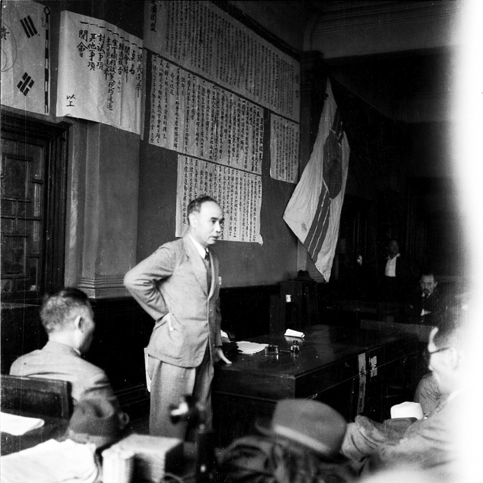 *写真=日本の敗戦翌日である1945年8月16日、ソウルのYMCA会館で「建国準備委員会」結成の必要性について演説する呂運亨
