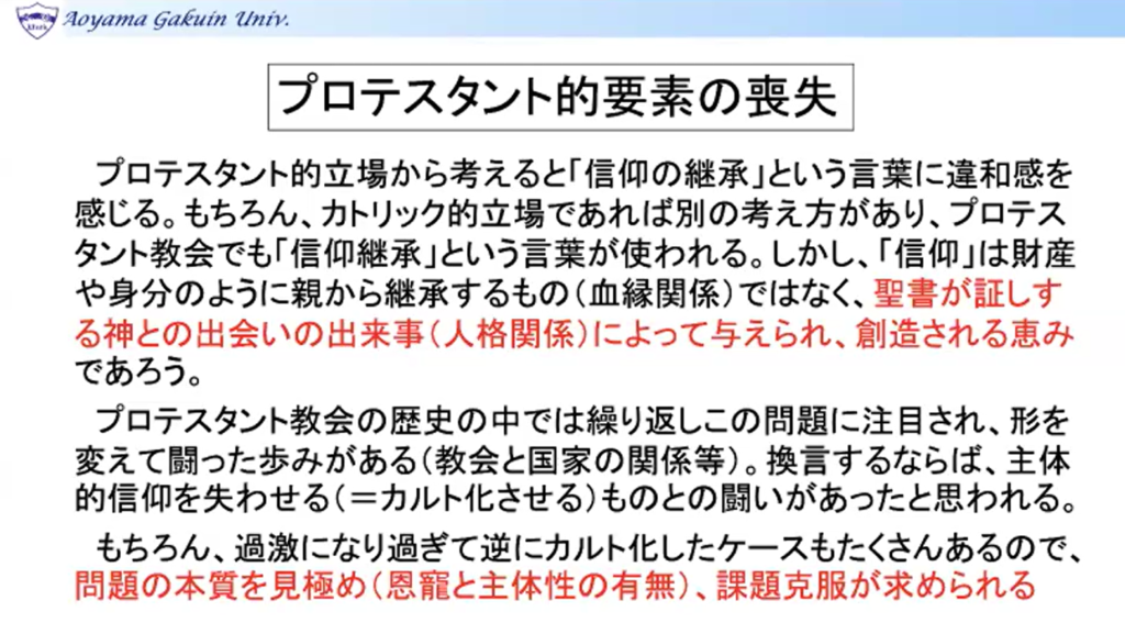 また、日本社会でカルト化が進む要因として、宗教・政治へのアレルギーと学ぶことを避ける風潮を挙げ、表層的な距離感は健全であっても、考えることを放棄すればいっそう支配されやすくなるとし、教会においても救済の根拠を問うことを許さず、主体的信仰(プロテスタント的要素)が失われることで、禁欲的倫理宗教(恩寵なき倫理)に陥る危険性があると警鐘を鳴らした。
