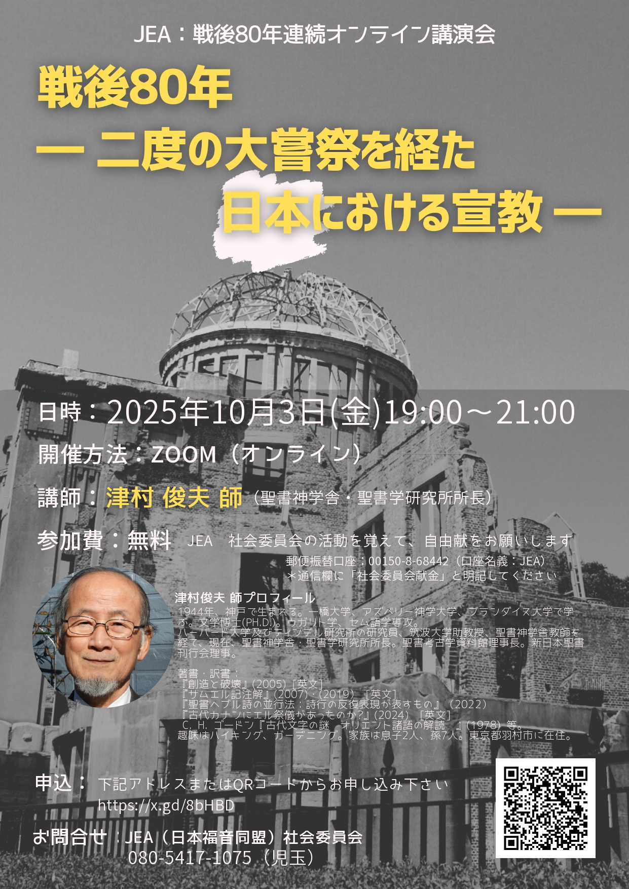 日本福音同盟社会委員会の主催による戦後80年連続企画の第2回となる講演会「戦後80年 二度の大嘗祭を経た日本における宣教」が10月3日、オンラインで開催された。講師は津村俊夫氏(聖書神学舎・聖書学研究所所長)。